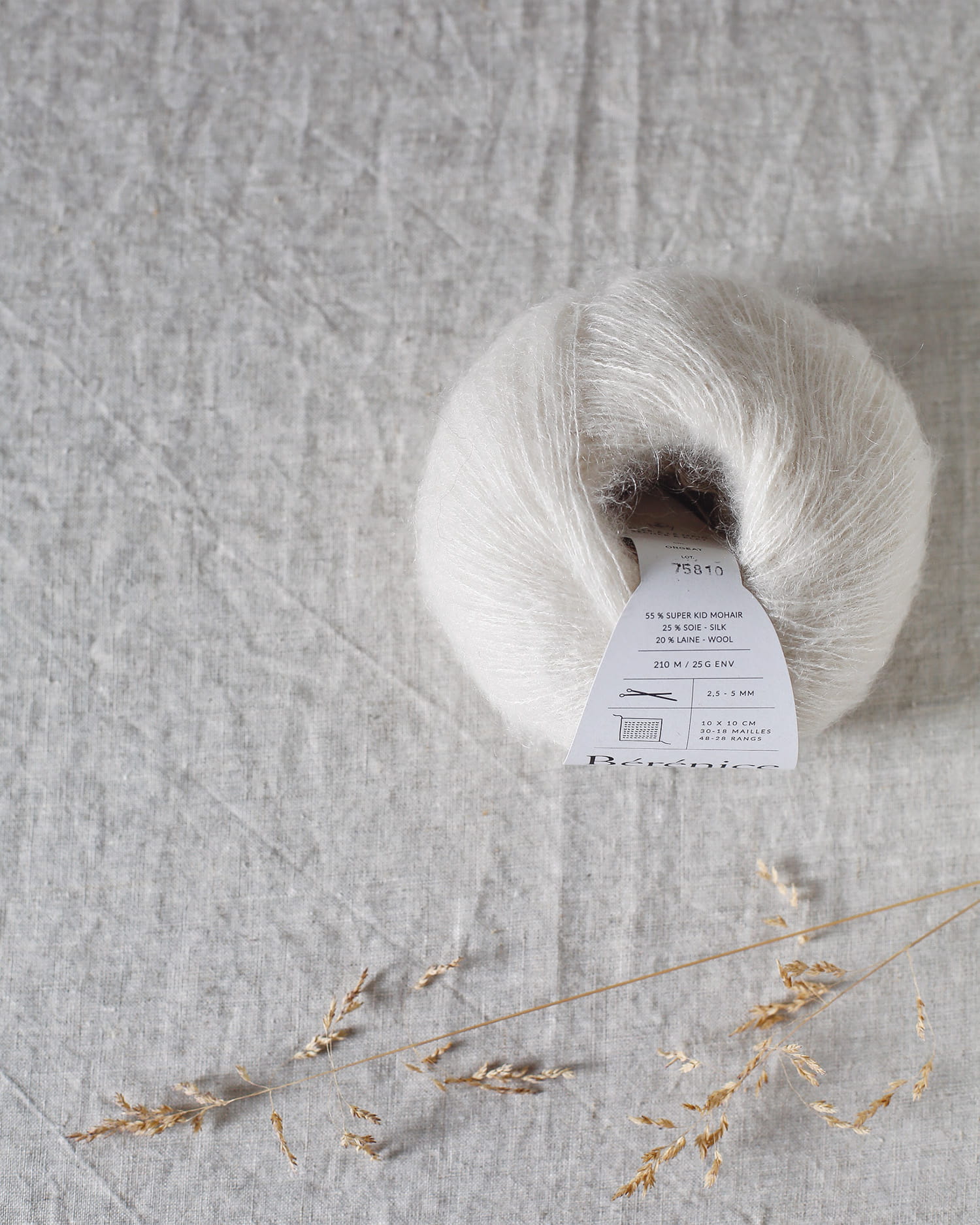 Bérénice to produkowana we Włoszech luksusowa mieszanka włókien kóz angorskich oraz organicznej wełny Merinos d'Arles, przędzonych wokół mocnej jedwabnej nitki. Przędza farbowana jest przy użyciu ekologicznych barwników zgodnych ze specyfikacjami GOTS. Idealnie komponuje się z innymi włóczkami, dodając im blasku oraz miękkości. Przy samodzielnym użyciu tej włóczki powstanie bardzo puszysta i prześwitująca struktura, która zapewni wyjątkowy wygląd tworzonym produktom.