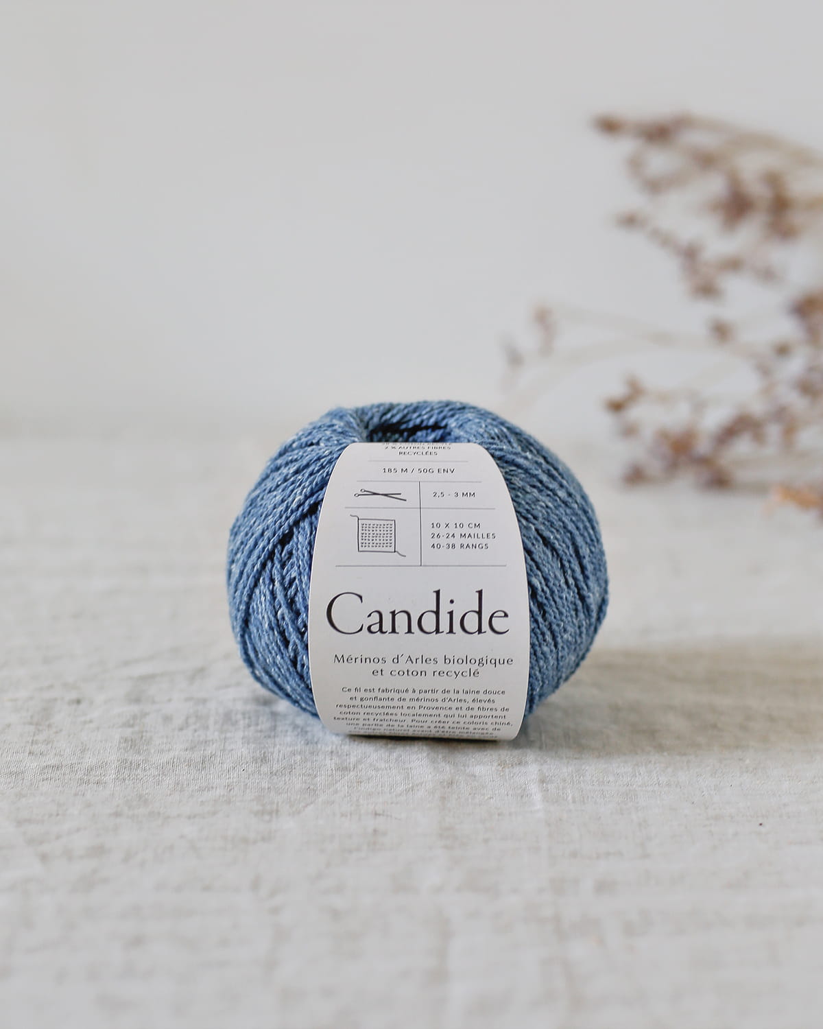 Włóczki są przędzone oraz farbowane we Francji. Małe płatki bawełny tworzą oryginalną strukturę. Jest to dość sucha włóczka, która zyskuje miękkość i puszystość po wypraniu. Candide to idealna włóczka na projekty międzysezonowe, dzięki lekkości wełny i przewiewności bawełny.