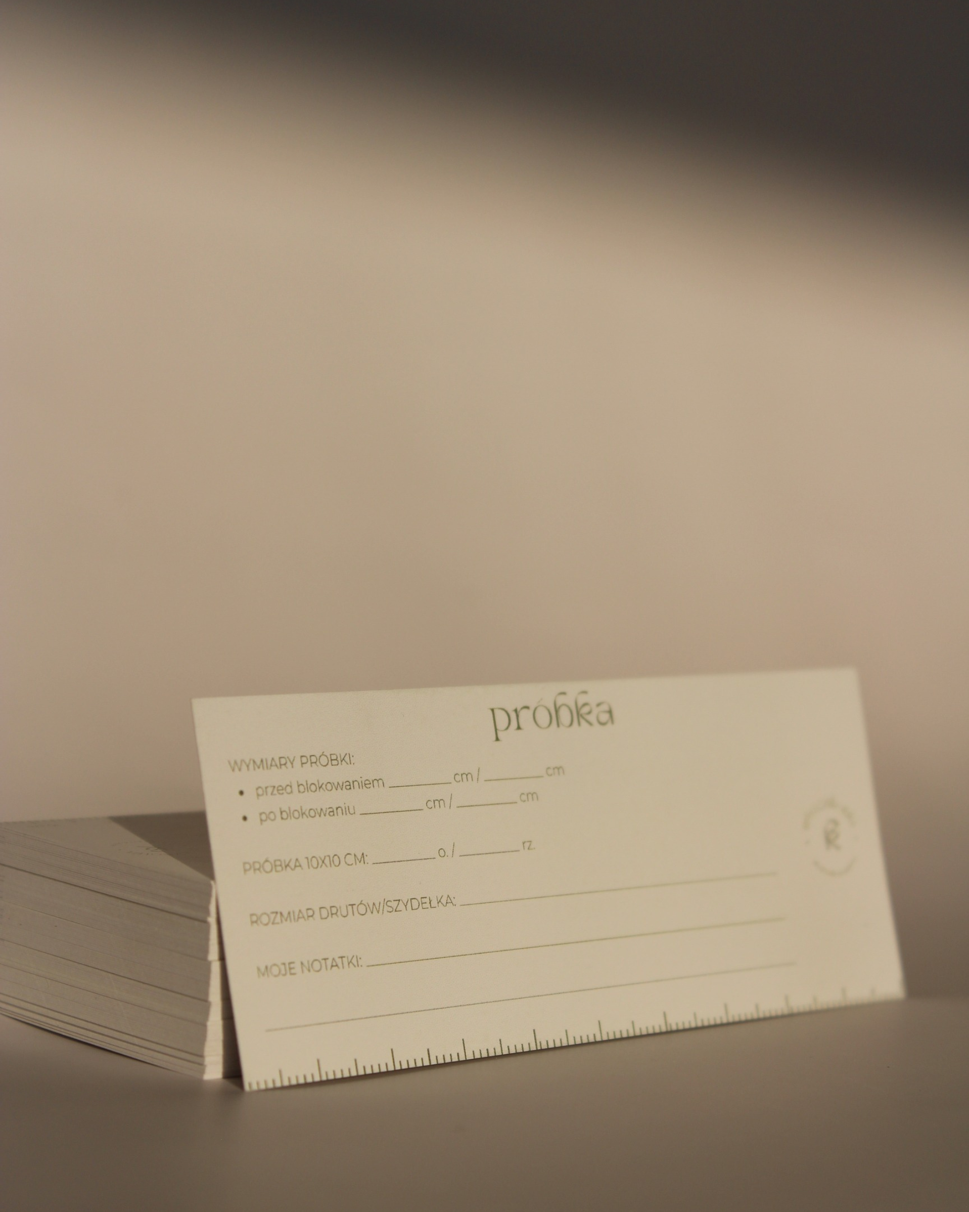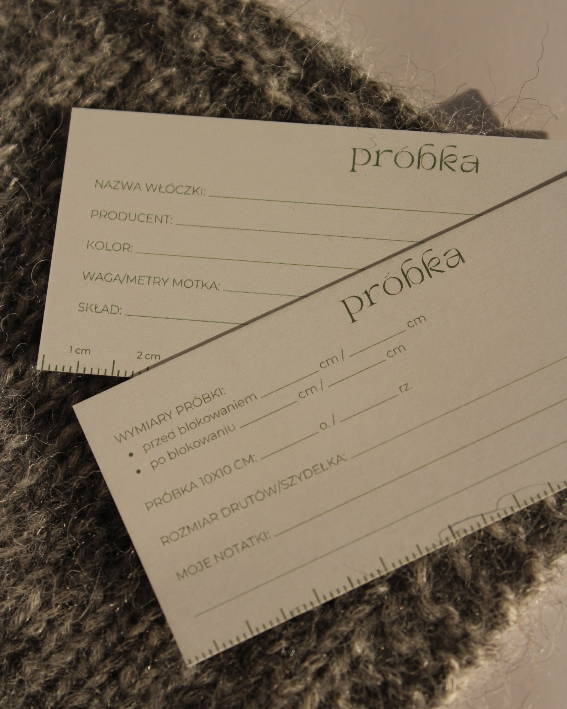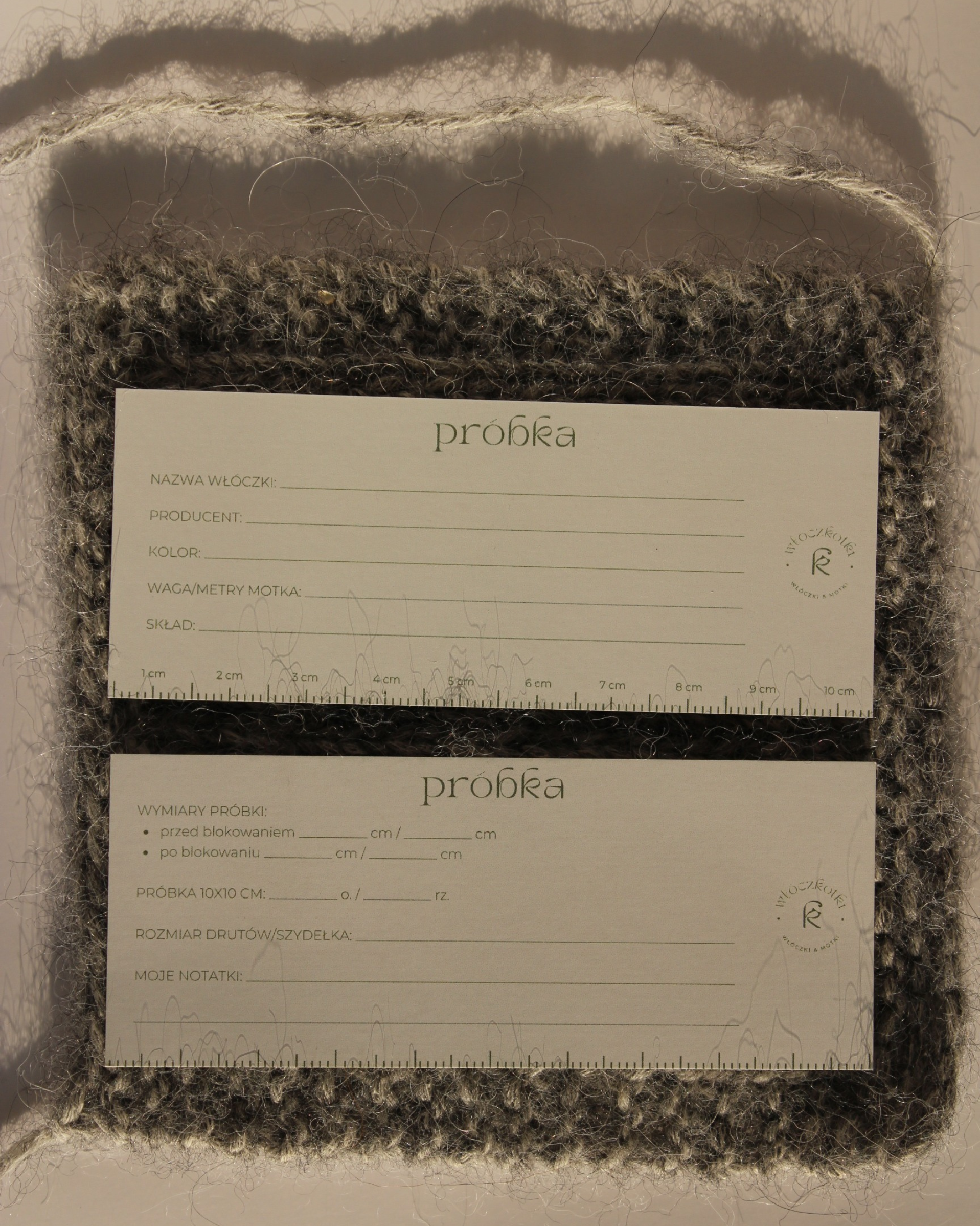 - Druga strona pozwala szczegółowo opisać Twoją próbkę: liczba oczek i rzędów na 10x10 cm oraz wymiary przed i po blokowaniu, użyty rozmiar drutów lub szydełka, a także miejsce na własne uwagi. Możesz zanotować, do jakiego projektu używasz próbki lub swoje odczucia dotyczące pracy z włóczką.