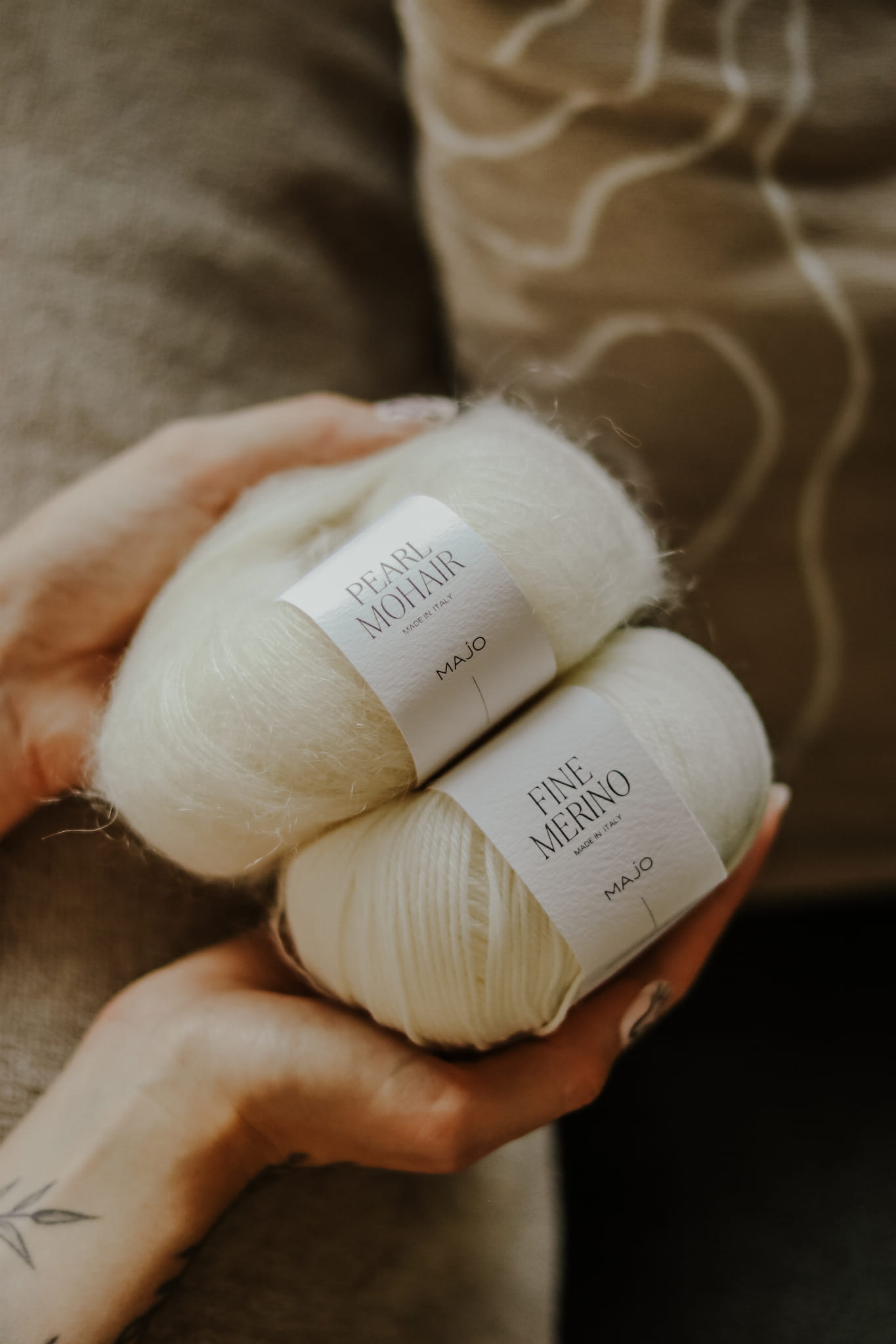 Fine Merino można dziergać zarówno pojedynczą, jak i podwójną nitką, a także łączyć z Pearl Mohair, tworząc unikatowe tekstury i efekty.